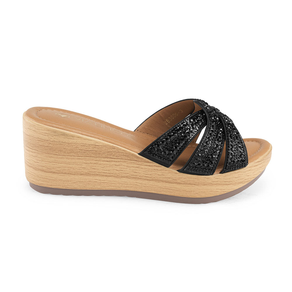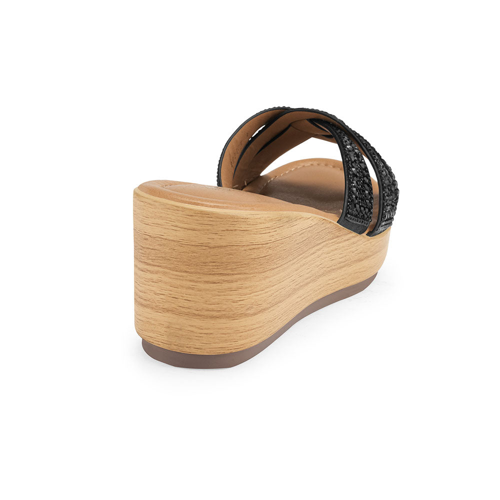 Un modelo moderno y llamativo que combina comodidad con estilo. Su diseño tipo mule en color negro destaca por las tiras frontales con acabado brillante, que aportan un toque elegante y actual. La plataforma tipo madera ofrece altura y estabilidad, ideal para acompañarte durante el día sin perder confort.